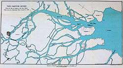 On the morning of 27 February, the Calliope, Herald, Alligator, Sulphur, Modeste, and the steamers Madagascar and Nemesis sailed past the Bocca Tigris along the Pearl River.[3] Lieutenant John Elliot Bingham of the Modeste wrote, "As these ships sped along, the shore was lined with thousands of the inhabitants gazing on the bold barbarians, many of them, no doubt, secretly wishing them success."[4] Commodore James Bremer placed Captain Thomas Herbert of the Calliope in command of the fleet. After sailing past Tiger Island and Second Bar, they reached near First Bar Island by noon.[5] There, the British spotted the Cambridge, a former East Indiaman, hoisting the red flag of a Chinese admiral. The long Chinese field fortifications facing the river mounted 47 guns, and rows of white tents in the neighbouring paddy fields indicated a large number of Tartar troops. Over 40 war junks were further up the river.[4][6]