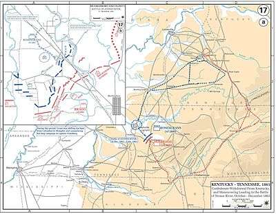 Bragg's forces were situated with Leonidas Polk's corps on the west side of the river, William J. Hardee's men on the east. He had expected Rosecrans to attack on December 30, but when that attack did not come, his plan was to drive Hardee's corps and the cavalry under Brig. Gen. John A. Wharton deep into the Union rear. He began moving the bulk of Hardee's corps across the river to his left flank in preparation for the next morning's attack. This left Breckinridge's division in reserve on the east side of the river on the high ground.[15]