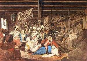 Almost all of the area was pillaged and inhabitants of the Praga district were tortured, raped and murdered. The exact death toll of that day remains unknown, but it is estimated that up to 20,000 people were killed.[4] Suvorov himself wrote: "The whole of Praga was strewn with dead bodies, blood was flowing in streams."[11] It was thought that unruly Cossack troops were partly to blame for the uncontrolled destruction.[12] Some Russian historians claim that Suvorov tried to stop the massacre by ordering the destruction of the bridge to Warsaw over the Vistula river [13] with the purpose of preventing the spread of violence to Warsaw, but in fact he wanted to stop Polish troops stationing on the left bank from attacking his soldiers.[10] Other historians dispute this.[14]