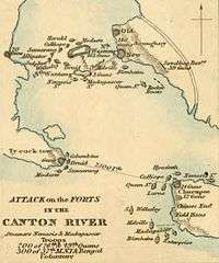 At daylight on 26 February, the three howitzers fired shells and rockets into North Wangtong and occasionally into Anunghoy.[13] British troops were ordered to be ready at 7:00 am,[14] but due to calm weather, the operation was delayed until 11:00 am, when the breeze was strong enough to sail.[15] The fleet began moving into position against the forts on Anunghoy and North Wangtong. In the attack on Anunghoy, Capt. Humphrey Fleming Senhouse of the Blenheim, aided by the Melville, Queen steamer, and four rocket boats,[13] approached the southern fort, dropped its anchor 600 yards (550 m) away, and fired broadsides from its starboard guns. The Melville approached five minutes later off the portside of the Blenheim, sailed within 400 yards (370 m) of the fort, and fired broadsides in quick succession.[16][17] A British officer wrote, "The firing of these ships was most splendid: nothing could withstand their deadly aim ... One or two shot were sufficient for the 'dragon-hearted' defenders of the north fort, who, 'letting' off their guns, fled up the hills."[17] After bombarding and silencing the Anunghoy batteries, Senhouse landed on the southern battery with about 300 marines and men carrying small arms to clear out the few remaining defenders. Within two hours, the Anunghoy forts were seized.[13][18] Chinese Adm. Guan Tianpei was among the estimated 250 killed or wounded in Anunghoy. After his family identified his body the next day, the Blenheim fired a minute-gun salute in his honour as his body was taken away.[19]