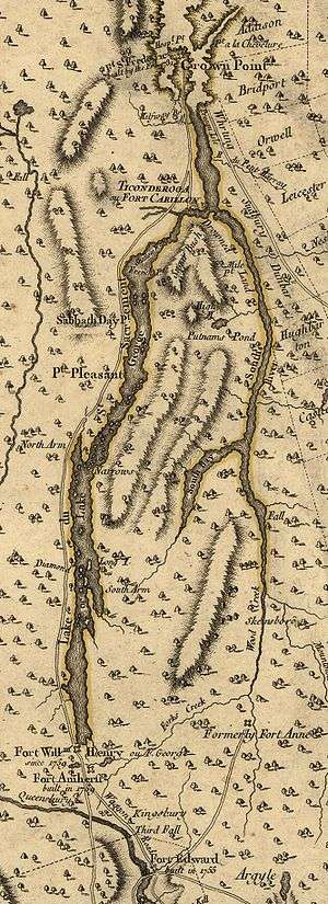 The French and Indian War broke out in 1754 between British and French colonists over territorial disputes along their colonial frontiers, and escalated the following year to include regular troops.[4] By 1756, the French had enjoyed successes in most of their frontier battles against the British. Their only notable failure occurred when the British stopped their southward advance from Lake Champlain in the 1755 Battle of Lake George. From bases at Fort St. Frédéric (located at what is now Crown Point, New York) and Fort Carillon (known to the British as Fort Ticonderoga), the French and their Indian allies continued to scout and probe the British defenses on Lake George and the upper Hudson River.[5] The British, who had fewer Indian allies, resorted to companies of rangers for their scouting and reconnaissance activities.[6] The ranger companies were organized and directed by Robert Rogers, and eventually became known as Rogers' Rangers.[7]