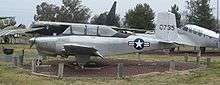 In 1955 Beechcraft developed a jet-engined derivative, again as a private venture, and again in the hope of winning a contract from the US military.[2] The Model 73 Jet Mentor shared many components with the piston-engined aircraft; major visual differences were the redesigned cockpit which was relocated further forward in the fuselage and the air intakes for the jet engine in the wing roots, supplying air to a single 920 lbf (4.1 kN) Continental J69 jet engine in the rear fuselage.[2][4] The first flight of the Model 73, registered N134B, was on 18 December 1955. The Model 73 was evaluated by the USAF, which ordered the Cessna T-37, and the USN, which decided upon the Temco TT Pinto. After initial testing at the Naval Air Test Center at NAS Patuxent River, Maryland, the Navy tested the feasibility of using the TT Pinto as a jet-powered trainer for primary flight training in 1959, but discontinued use of the aircraft by December 1960 and discarded all examples, returning to the piston-powered T-34B Mentor and North American T-28 Trojan for its primary flight training requirements. The Beechcraft Model 73 was not put into production[2] and the sole prototype is displayed at the Kansas Aviation Museum.[5]