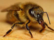 A temulent bee is more likely to stick out its tongue, or proboscis. Inebriated bees spend more time flying. If a bee is sufficiently intoxicated, it will just lie on its back and wiggle its legs. Inebriated bees typically have many more flying accidents as well. Some bees that consume ethanol become too inebriated to find their way back to the hive, and will die as a result.[5] Bozic et al. (2006) found that alcohol consumption by honeybees disrupts foraging and social behaviors, and has some similar effects to poisoning with insecticides.[6] Some bees become more aggressive after consuming alcohol.[7]