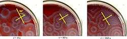 Strikingly similar oscillatory spiral patterns appear elsewhere in nature, at very different spatial and temporal scales, for example the growth pattern of Dictyostelium discoideum, a soil-dwelling amoeba colony.[7] In the BZ reaction, the size of the interacting elements is molecular and the time scale of the reaction is minutes. In the case of the soil amoeba, the size of the elements is typical of single-celled organisms and the times involved are on the order of days to years.