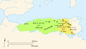 Circa 220 BC, three large Berber kingdoms had arisen. Markedly influenced by Punic civilization, they had nonetheless endured as separate Berber entities, their culture surviving throughout the long reign of Carthage. West to east these kingdoms were: (1) the Mauri (in modern Morocco) under king Baga; (2) the Masaesyli (in northern Algeria) under Syphax, who then controlled two capitals: to the west Siga (near modern Oran) and to the east Cirta (modern Constantine); and (3) the Massyli (south of Cirta, west and south of nearby Carthage), ruled by Gala [Gaia] (the father of Masinissa). Following the Second Punic War, Massyli and eastern Masaesyli were joined to become Numidia, located in historic Tunisia. Here Masinissa ruled and reigned. Both Rome and the Hellenic states gave Masinissa the honors befitting an admired king.[8]