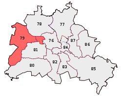 The constituency, numbered constituency 79 by the German electoral authorities,[1] contains the whole of the Berlin borough of Spandau. This area formed its own constituency until the 2002 election. For that election, as part of a wider reform which reduced the number of Bundestag constituencies, Berlin lost one of its thirteen seats. Consequently the Spandau constituency expanded to take in the neighbourhood of Charlottenburg-Nord, located in the borough of Charlottenburg-Wilmersdorf. Prior to 2002, Charlottenburg-Nord was part of the Berlin Tiergarten - Wedding - North Charlottenburg constituency.
