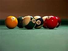 The balls range from 2.25 inches (57.15 mm) in diameter to 2.375 inches (60.33 mm) in diameter.[5] Under the WPA/BCA (see below) equipment specifications, the weight may be from 5.5 to 6 oz. (156–170 g) with a diameter of 2.25 in. (57.15 mm), plus or minus 0.005 in. (0.127 mm).[6][7] Modern coin-operated pool tables generally use one of three methods to distinguish and return the cue ball to the front of the table while the numbered balls return to an inaccessible receptacle until paid for again: the cue ball is larger and heavier than the other balls, or denser and heavier, or has a magnetic core.