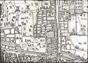 A distinction is sometimes drawn between a bird's-eye view and a bird's-flight view, or "view-plan in isometrical projection".[1] Whereas a bird's-eye view shows a scene from a single viewpoint (real or imagined) in true perspective, including, for example, the foreshortening of more distant features, a bird's-flight view combines a vertical plan of ground-level features with perspective views of buildings and other standing features, all presented at roughly the same scale.[2] The landscape appears "as it would unfold itself to any one passing over it, as in a balloon, at a height sufficient to abolish sharpness of perspective, and yet low enough to allow of distinct view of the scene beneath".[3] The technique was popular among local surveyors and cartographers of the sixteenth and early seventeenth centuries.