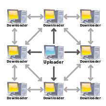 Animation of protocol use: The colored dots beneath each computer in the animation represent different parts of the file being shared. By the time a copy to a destination computer of each of those parts completes, a copy to another destination computer of that part (or other parts) is already taking place between users. The tracker (server) provides only a single copy of the file, and all the users clone its parts from one another.