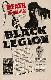 Black Legion is a 1937 American crime drama film, directed by Archie Mayo, with a script by Abem Finkel and William Wister Haines based on an original story by producer Robert Lord. The film stars Humphrey Bogart, Dick Foran, Erin O'Brien-Moore and Ann Sheridan. It is a fictionalized treatment of the historic Black Legion of the 1930s in Michigan,[1] a white vigilante group. A third of its members lived in Detroit, which had also been a center of the Ku Klux Klan in the 1920s.