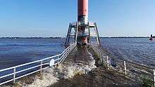 The 42 meter high, red and white striped concrete tower with white steel lantern house was built in 1984. The column has 12 Portholes to river and 2 behind and the lantern house has another 6. It stands in the Elbe, approximately 1,340 meters from the rear light, and is on a circa 30 meters long Platform, stack reached. On the base of the Tower has a 2 level staircase Deck, which is 5 m high, 2.5 m each floor in a trapezoid Steel frame form section with an Octagon plant design. [2] The tower itself works as a sun clock pointer to the people seating at its shadow side concrete banks around a tree. Inside it has a helix staircase driving to the top. There is not a seating place at the top of the Platform, only at the bottom, which by high Tide sometimes get washed. At the third floor, it has a door with a plate showing the function of the Structure. However due Graffiti this is covered to see. The concrete foundation was established using a caisson with an average of 5 m inside water different Tide between maximum high and lowest one. It weighs over 700 tons and reaches 10 meters below the water surface. The 11 ton lantern house was assembled with the help of a floating crane. The lighthouse is remotely controlled by the Seemanshöft Pilot Centre and belongs to the Hamburg Port Authority.