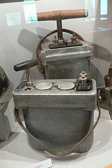 A blasting machine or shot exploder is a portable source of electric current to reliably fire a blasting cap to trigger a main explosive charge. It is mostly used in mining and demolition.