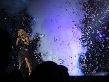 Underwood performed "Blown Away" on American Idol on May 3, 2012, the week of the album's release. Amy Sciarretto of Taste of Country summarized the performance, writing, "Underwood was elevated on steps as she performed, with storm clouds roaring on the screens behind her. She was bathed in light as smoke billowed at feet."[33] The same month, she performed the song at the 2012 Billboard Music Awards, dressed in a long, red gown.[34] The singer also performed it at the 2012 Country Music Association Awards. Throughout the performance, wind machines were used while confetti flew through the air.[35] In 2013, Underwood performed "Blown Away" again at the same award show, this time in a medley with "Good Girl", "See You Again" and "Two Black Cadillacs", representing the ending of the Blown Away era.[36] The same year, she performed an acoustic version of the song during the 55th Annual Grammy Awards.[37] "Blown Away" was performed as the encore of Underwood's Blown Away Tour (2012–13), along with "I Know You Won't".[38]