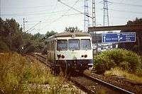 Until 1978, the Deutsche Bundesbahn passenger service ran from Bochum-Langendreer via Bochum-Nord, Bochum-Riemke to Wanne-Eickel (see Bochum-Riemke–Wanne-Eickel line below). After the construction of a connecting curve from Bochum Central Station (Hauptbahnhof) to the line towards Riemke in 1979,[2] passenger services ran until 1990 from Bochum over the curve from Herne-Rottbruch to Herne,[3] but subsequently services ran via Wanne-Eickel to Gelsenkirchen Central Station.[4] Herne Rottbruch station represented a special case for operations, because it is located on a bridge over autobahn 43, but it has not been served since 1990.[5] In the early 90s, the electronics manufacturer Nokia, which then had a factory near the railway, sponsored the modernisation of the fleet (starting with three vehicles of class 515 battery electric multiple units and followed by class 628 diesel multiple units). As a result, the line was renamed the Nokia-Bahn ("Nokia Railway") and Bochum-Graetz station was renamed Bochum-Nokia. Following Nokia’s closure of its Bochum factory in late 2008, the line was renamed the Glückauf-Bahn. At the timetable change of 2009/10, the station was renamed Bochum-Riemke.[6]