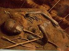 A bog body is a human cadaver that has been naturally mummified in a peat bog. Such bodies, sometimes known as bog people, are both geographically and chronologically widespread, having been dated to between 8000 BCE and the Second World War.[1] The unifying factor of the bog bodies is that they have been found in peat and are partially preserved; however, the actual levels of preservation vary widely from perfectly preserved to mere skeletons.[2]