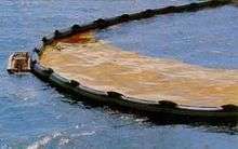 A containment boom is a temporary floating barrier used to contain an oil spill. Booms are used to reduce the possibility of polluting shorelines and other resources, and to help make recovery easier. Booms help to concentrate oil in thicker surface layers so that skimmers, vacuums, or other collection methods can be used more effectively. They come in many shapes and sizes, with various levels of effectiveness in different types of water conditions."[1]