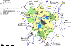 The next towns to Borken are Fritzlar (15 km) in the northwest and Homberg (15 km) in the west. Within 50 km distance is Kassel the next large city in the north and with 55 km Marburg in the south.