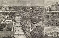 The Boulevard Saint-Germain was the most important part of Haussmann's renovation of Paris (1850s and '60s) on the Left Bank. The Boulevard replaced numerous small streets which approximated its path, including, from west to east (to the current Boulevard Saint-Michel), the rue Saint-Dominique, rue Taranne, rue Sainte-Marguerite, rue des Boucheries and rue des Cordeliers.[1] One landmark removed to make way for the project was the prison of the Abbey of Saint-Germain-des-Prés which stood entirely on what is now the Boulevard, just west of what is now the Passage de la Petite Boucherie.[1]
