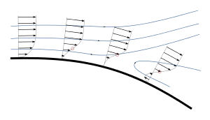 Boundary layer separation is the detachment of a boundary layer from the surface into a broader wake.[3] Boundary layer separation occurs when the portion of the boundary layer closest to the wall or leading edge reverses in flow direction. The separation point is defined as the point between the forward and backward flow, where the shear stress is zero. The overall boundary layer initially thickens suddenly at the separation point and is then forced off the surface by the reversed flow at its bottom.[4]