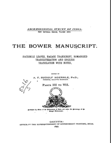 - A. F. Rudolf Hoernle, The Bower manuscript; facsimile leaves, Nagari transcript, romanised transliteration and English translation with notes (Calcutta: Supt., Govt. Print., India, 1908-1912. reprinted New Delhi: Aditya Prakashan, 1987; archive.org edition)
