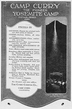 David and Jennie Curry, owners and operators of Curry Village, were schoolteachers who arrived in Yosemite Valley in 1899.[6] The couple offset some of their vacation costs by giving camping tours, having experimented early on in Yellowstone National Park. For three summers in a row, the Currys led teachers on camping outings to Yellowstone with horse and wagon;[7] arriving in Yosemite with a cook and seven tents. Despite the two week, round trip travel period from Merced, California, the camp registered 292 guests its first year.[8] The couple brought their three children with them. Foster, Mary and Marjorie (ages four through eleven) all helped out where they were able.[7] The Curry Company came to dominate the politics of the park for decades. David wrote the Secretary of the Interior, Franklin Lane, in an effort extend the park's tourist season, hoping to expand his business.[6] The Currys were adept at promotion and revived an old tradition started by James McCauley on the Fourth of July 1872. At sunset, piles of burning logs were pushed off Glacier Point creating what was known as the Fire Fall.[9] The theory was, national parks were for recreational use.[10] David Curry died in 1917 and left the management of Camp Curry to his widow Jennie, now known as "Mother Curry". She received help from her children, particularly Mary and Mary's husband Donald Tresidder.[7]