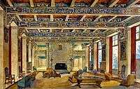 The original concept art of the hotel was far more megalithic in scale than what was built.[28] Underwood's original design concept called for a massive six story structure.[10] Tresidder and the board originally had requested a hotel with only 100 guest rooms that felt like a luxurious country home and not a hotel. The design was changed several times and at one point was to be no larger than three stories, with a wooden and stone construction. Plans then changed again, to a larger scale.[29] Interior designs and designers had also changed. The husband and wife team of Ackerman and Pope were chosen over artist/interior designer Henry Lovins from Los Angeles. Lovins' interior design renderings, provided by Elizabeth Lovins (Director of the Hollywood Art Center Archive), depict a "Mayan revival" drawing of Hispano-Moresque styling.[10] Historians, Ackerman and Pope created a style that mixed Art Deco, Native American, Middle Eastern, and Arts and Crafts.[30] A lot of decoration originally used was Persian. (Ackerman and Pope actually became consultants in Iran. Pope even has a mausoleum built for him by the Shah.)[31]