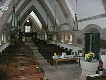 The interior's most striking feature is the lofty vaulted roof, formed of four bays of lime-washed shuttered concrete, divided by slender sandstone arches (the stone came from the now-redundant local Capler quarry). At Brockhampton, Lethaby predicted the Modern Movement's short-lived passion for patterned concrete surfaces, by leaving the internal face of the Nave's roof lining unplastered.