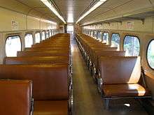 The design of the Budd Silverliner was based on a lightweight stainless steel body and frame coupled to an advanced AC/DC rectifier propulsion system and new lightweight, high-speed trucks. While largely identical to the earlier Pioneer III's, differences included a single-arm Faiveley pantograph, a state-of-the-art propulsion system that made use of solid-state phase angle controllers coupled to mercury arc ignitron rectifiers, higher-powered motors, a higher-capacity main transformer, multi-function couplers and disc brakes. One result of these upgrades was that the Silverliners were incompatible with the six Pioneer prototypes. Passenger amenities were also identical to the Pioneer III cars offering riders air cushion suspension, air conditioning, electric train heat and a nearly silent acceleration and braking. With 150 hp (110 kW) more than the Pioneer III cars (550 hp or 410 kW total), the Silverliners could achieve a 1.7 mph/s (2.7 km/(h·s)) acceleration rate, which was far higher than the older MP54s[1] and a top speed of 85–100 mph (137–161 km/h) compared with the 55–65 mph (89–105 km/h) of the MP54 fleet (which was not often reached in service).[1] Inside, the cars were equipped with 25 rows of 3+2 reversible (flipover) bench seating with 124 usable seats and either a bathroom or an additional 3-person bench seat. The seats were initially furnished in a dark gray diamond-patterned foam rubber "plush", which began to wear out by the mid-1970s. Four cars (#259, #269, #9012 and #9015) were experimentally retrofitted with brown vinyl leatherette seats. However, the balance of the fleet was redone in the SEPTA/Conrail era with canvas-textured padded covering in a so-called "Ketchup and Mustard" theme, with the three-person seats upholstered in mustard yellow and the two-person seats done in a dark ketchup red.