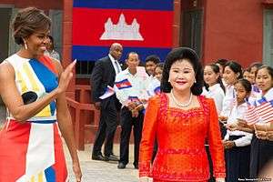 Bun Rany (Khmer: ប៊ុន រ៉ានី; born Bun Sam Hieng, 15 December 1954) is a Cambodian humanitarian worker, nurse and, as the wife of long-time Cambodian Prime Minister Hun Sen, First Lady of Cambodia. She has served as the vice president of the National Association of the Cambodian Red Cross and, since 1998, as its president.[3] She has received national and international recognition and numerous awards for her work with Cambodia's orphans and poor, HIV/AIDS awareness and prevention, and her emphasis on women's issues with efforts to improve domestic safety and empowerment through education and vocational training.[3] Her full honourary title is Samdech Kittipritbandit Bun Rany Hun Sen (Khmer: សម្តេចកត្តិព្រឹទ្ធបណ្ឌិតប៊ុន រ៉ានី ហ៊ុន សែន; literally "Celebrated Senior Scholar Bun Rany Hun Sen").[4]
