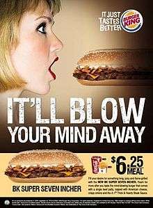 A 2009 advertising campaign in Singapore for the company's new BK Super Seven Incher cheeseburger, caused a notable controversy over the content of the ad. Originally and erroneously attributed to Burger King's advertising firm at the time, Crispin Porter + Bogusky, which had generated controversy with some misogynistic and culturally insensitive American and European advertisements,[47][48][49] it was later revealed that a local, unnamed Singaporean firm was responsible for the campaign.[50] The print version of the advertisement (pictured) made an overt association with the sandwich and oral sex using imagery and less-than subtle innuendo in the printed description in the advertisement.[51] Critics across the globe complained that the ad was "disgusting",[50][52] and went "too far".[52]