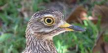 The Burhinus are commonly called thick-knee, stone-curlew or dikkop. They are medium-sized, terrestrial waders, though they are generally found in semi-arid to arid, open areas. Only some species of Burhinus are associated with water. The genus ranges from 32 cm to 59 cm in size. Burhinus are characterised by their long legs, long wings and cryptic plumage. Most species have a short, thick, strong bill.[1][3] The stone-curlews are found all over the world except Antarctica. They are mainly tropical, with the greatest diversity in the old world.[1]