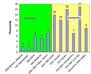 After a flurry of military campaigns by Anawrahta, Pagan entered a gilded age that would last for the next two centuries. Aside from a few occasional rebellions, the kingdom was largely peaceful during the period. The most serious was the 1082–1084 rebellion by Pegu (Bago), which nearly toppled the Pagan regime. In the 1110s, Pagan sent two separate expeditions to Arakan to place its claimant Letya Min Nan on the Arakanese throne. The first expedition failed but the second in 1118 succeeded.[10] Sinhalese Mahavamsa Chronicles mention a dispute over trade in elephants between Burma and Sri Lanka that prompted the Ceylonese forces to raid Lower Burma in 1180.[9][11]
