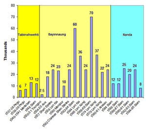 The Royal Burmese Army was a major Southeast Asian armed force between the 11th and 13th centuries and between 16th and 19th centuries. It was the premier military force in the 16th century when Toungoo kings built the largest empire in the history of Southeast Asia.[1] The centuries-long warfare between Burma and Siam (1547–1855) shaped not only the history of both countries but also that of mainland Southeast Asia. In the 18th and early 19th centuries, highly militaristic Konbaung kings had built the largest empire in mainland Southeast Asia until they ran into the British in present-day northeast India.[2][3] Prior to the three Anglo-Burmese wars (1824–1885), previous existential threats to the country had come from China in the form of Mongol invasions (1277–1301) and Manchu invasions (1765–1769).