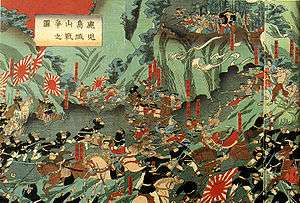 Saigō Takamori (upper right, in Western uniform) directing his troops, some of them in traditional samurai armor, at the Battle of Shiroyama.