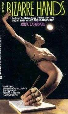 By Bizarre Hands is the first collection of short stories by American writer Joe R. Lansdale, published in 1989. The collection was nominated for a Bram Stoker Award[1] for best fiction collection, and contains two stories which won Stokers. It has an introduction by Lewis Shiner. This book was re-issued as By Bizarre Hands Rides Again in 2010. The re-issue contains a new introduction by Joe R. Lansdale and new artwork by Alex McVey. This book is limited to 300 copies and is signed by both writer and artist. It also contains two stories not in the original issue.