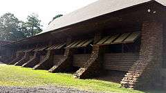 The CCC built a number of significant buildings in the park, including administrative and public-use facilities. The most prominent of these is probably Mather Lodge, a large Rustic stone building built in 1935, enlarged in 1940 (also by the CCC), and again about 1960, when its restaurant wing was added.[2] The main administration building, now partly converted to a gift shop, was also built about 1935.[3] One of the more unusual buildings the CCC erected in the park is its original water treatment building (now abandoned), a roughly square stone structure, which, despite its remote location away from the tourist facilities, is still in the Rustic style of its public buildings. It was in the park's early years a critical element of its infrastructure, housing equipment that filtered and sanitized water for park visitors.[4]