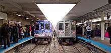 The CTA Holiday Train is a Chicago 'L' train which traditionally runs during the winter holidays, from November to December.[1] Six cars are traditional passenger cars adorned with seasonal decorations and bright lights. The interior of these cars are decked out with multi-color lights, red bows, garland, and red and green overhead lighting. The hand poles are transformed into inedible candy canes. Santa Claus rides on an open-air flatcar and waves to the passengers coming aboard from his sleigh.