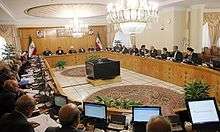 The Cabinet of Iran (officially: Persian: دولت ايران, Government of Iran) is a formal body composed of government officials, ministers, chosen and led by a President. Its composition must be approved by a vote in the Parliament. According to the Constitution of the Islamic Republic of Iran, the President may dismiss members of the cabinet, but must do so in writing, and new appointees must again be approved by the Parliament. The cabinet meets weekly on Saturdays in Tehran. There may be additional meetings if circumstances require it. The president chairs the meetings.