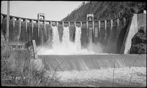 Alcoa began developing the Little Tennessee Valley in 1909 to provide the enormous amounts of electricity needed to power to its aluminum smelting operations in Blount County. Superintendent I.G. Calderwood oversaw the extension of a railway line from Chilhowee to what is now Calderwood (railroad bridge support columns are still visible in the river just downstream from the dam). Southern Railway engineers had suggested that the construction of this rail line would take six months, but Calderwood and his team accomplished the task in just six weeks.[6] The first of Alcoa's Little Tennessee Valley dams, Cheoah, was completed in 1919, and the second, Santeetlah, was completed in 1928.[5] Preliminary work on Calderwood Dam began in 1918, but test drilling suggested the site might not be satisfactory. Subsequent tests confirmed the site's stability, however, and construction began in 1927. The first two generating units went into operation on June 22, 1930, and a third unit was added in 1938.[3]