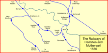 - Ferniegair; opened 1 December 1866 as northern terminus of passenger service; this was extended to Motherwell Bridge on 1 April 1868; relocated south of junction when the Hamilton line opened;