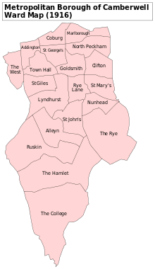The Metropolitan Borough of Camberwell wards of Addington, Lyndhurst, St Giles, Town Hall, and West.