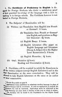 The target candidature was broadened beyond teachers, to "all foreign students who desire to obtain evidence of their practical knowledge of the languages, both written and spoken, as of their ability to read with comprehension standard works of English literature."