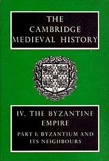 - ↑ The Cambridge Medieval History, Volume IV, The Byzantine Empire, Part I, Byzantium and its Neighbours, Part II, Government, Church and Civilisation, edited by J. M. Hussey Walter Christophersem, Revue des études byzantines, Volume 26 (1968), No. 1, pp. 412-415.