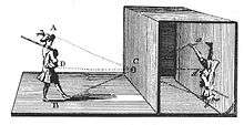 While the technical principles of the camera obscura have been known since antiquity, the broad use of the technical concept in producing images with a linear perspective in paintings, maps, theatre setups and architectural and later photographic images and movies started in the Western Renaissance and the scientific revolution. While e.g. Alhazen (Ibn al-Haytham) had already observed an optical effect and developed a state of the art theory of the refraction of light, he was less interested to produce images with it (compare Hans Belting 2005); the society he lived in was even hostile (compare Aniconism in Islam) towards personal images.[61] Western artists and philosophers used the Arab findings in new frameworks of epistemic relevance.[62] E.g. Leonardo da Vinci used the camera obscura as a model of the eye, René Descartes for eye and mind and John Locke started to use the camera obscura as a metaphor of human understanding per se.[63] The modern use of the camera obscura as an epistemic machine had important side effects for science.[64][65]
