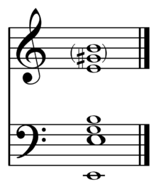 According to Fuller-Maitland writing in Grove's dictionary of music and musicians: "Good tone means that a bell must be in tune with itself."[20] A bell is generally considered well-tuned if it corresponds to certain standards regarding its partials and thus proportions. These partials or elements of the sound of a bell are split up into hum (an octave below the named note, see subharmonic), strike tone (tap note, named note), tierce (minor third), quint (fifth), and nominal (octave). Further notes include the major third and perfect fifth in the second octave. "Whether a founder tunes the nominal or the strike note makes little difference, however, because the nominal is one of the main partials that determines the tuning of the strike note."[21] A heavy clapper brings out lower partials (clappers often being about 3% of a bell's mass), while a higher clapper velocity strengthens higher partials (0.4 m/s being moderate). The relative depth of the "bowl" or "cup" part of the bell also determines the number and strength of the partials in order to achieve a desired timbre.