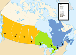 - ↑ One team plays on the Saskatchewan side of Lloydminster, a city bisected by the Alberta–Saskatchewan border.