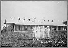 Two nurses who worked at Canberra Community Hospital on Acton in the 1930s were killed while serving in WWII. Sister Mona Tait, who had been a theatre sister in Canberra, was aboard the Vyner Brooke when it was sunk by the Japanese military and was subsequently amongst those nurses machine-gunned at Radji Beach (see Banka Island massacre).[4] Sister May Hayman at the outbreak of war was working in the hospital at Gona in New Guinea and while fleeing with Allied soldiers was ambushed by a Japanese patrol and bayoneted.[5]