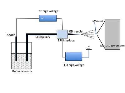 Capillary electrophoresis is a separation technique which uses high electric field to produce electroosmotic flow for separation of ions. Analytes migrate from one end of capillary to other based on their charge, viscosity and size. Higher the electric field, greater is the mobility. Mass spectrometry is an analytical technique that identifies chemical species depending on their mass-to-charge ratio. During the process, an ion source will convert molecules coming from CE to ions that can then be manipulated using electric and magnetic field. The separated ions are then measured using a detector. The major problem faced when coupling CE to MS arises due to insufficient understanding of fundamental processes when two techniques are interfaced. The separation and detection of analytes can be improved with better interface. CE has been coupled to MS using various ionization techniques like FAB, ESI, MALDI, APCI and DESI. The most used ionization technique is ESI.