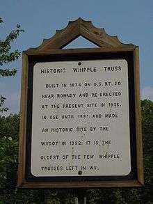 - Capon Lake Whipple Truss Bridge (1874), along WV Route 259, Listed on the National Register of Historic Places in 2011.