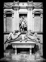 The Sagrestia Nuova[1] was intended by Cardinal Giulio de' Medici and his cousin Pope Leo X as a mausoleum or mortuary chapel for members of the Medici family. It balances Brunelleschi's Sagrestia Vecchia, the "Old Sacristy" nestled between the left transept of San Lorenzo, with which it consciously competes, and shares its format of a cubical space surmounted by a dome, of gray pietra serena and whitewashed walls. It was the first essay in architecture (1521–24) of Michelangelo, who also designed its monuments dedicated to certain members of the Medici family, with sculptural figures of the four times of day[2] that were destined to influence sculptural figures reclining on architraves for many generations to come. The Sagrestia Nuova was entered by a discreet entrance in a corner of San Lorenzo's right transept, now closed.[3]